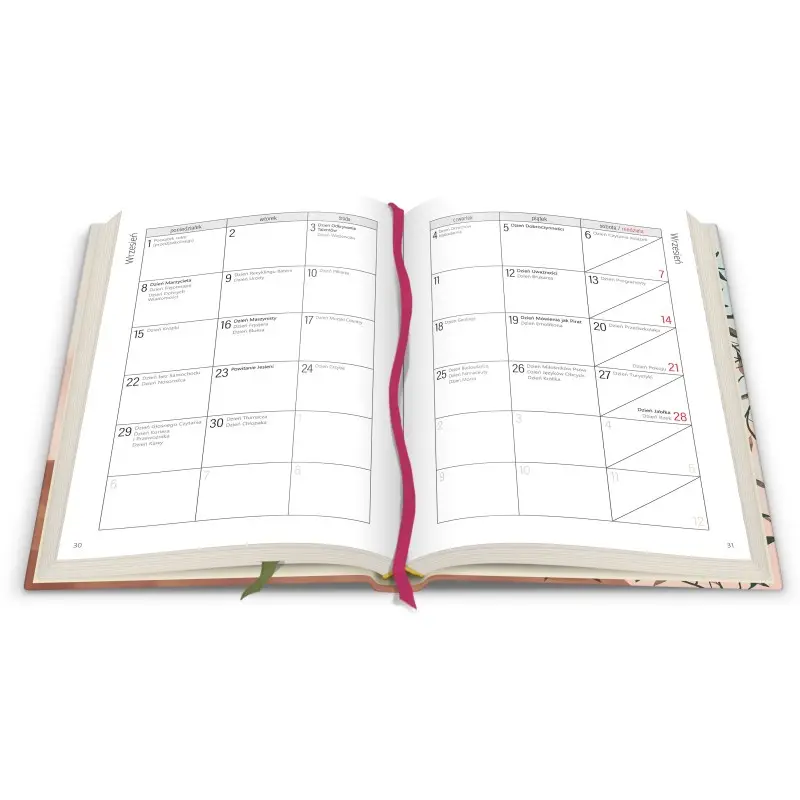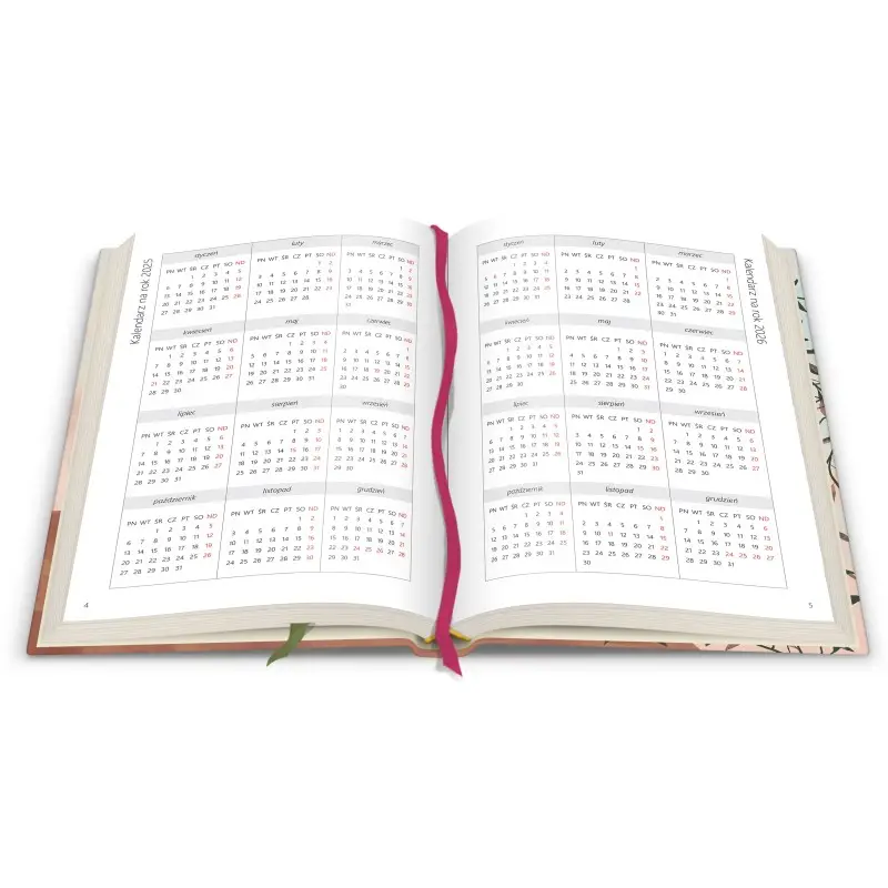 Tygodniowy układ dni na rozkładówce, poręczny format (145 x 207 mm), okładka wytrzymała i lekka